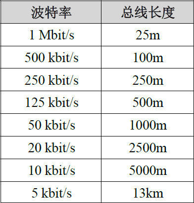 请注意:CAN-bus电缆可以使用普通双绞线、屏蔽双绞线。理论最大通信距离主要取决于总线波特率,最大总线长度和波特率关系详见下表。若通讯距离超过1km,应保证线的截面积大于Φ1.0mm2,具体规格应根据距离而定,常规是随距离的加长而适当加大。