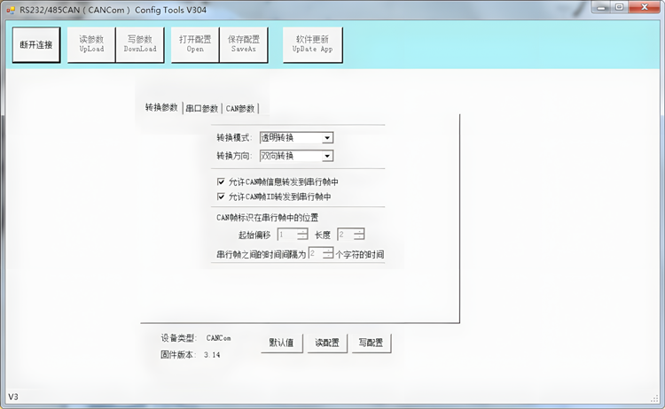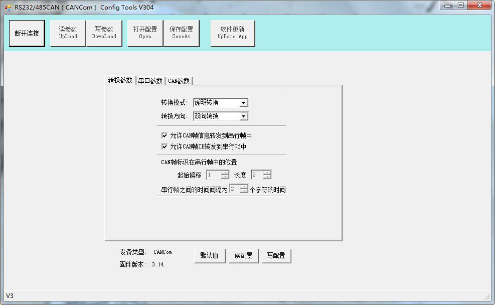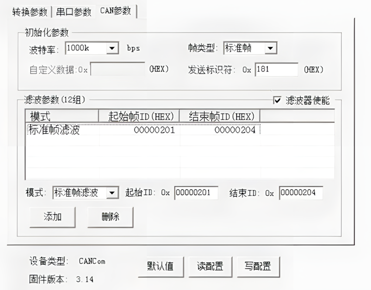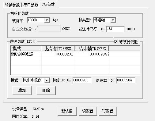 请注意:无论是串行帧还是CAN报文在应用的时候其帧格式(标准帧还是扩展帧)应该符合事先配置的帧格式要求,否则可能导致通讯不正常。