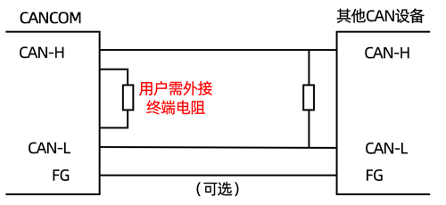 请注意:GCAN-201模块内部未集成120Ω终端电阻。如果节点数目大于2,中间节点不需要安装120Ω的终端电阻。需要使用时,将电阻两端分别接入CAN_H、CAN_L即可,如上图所示。