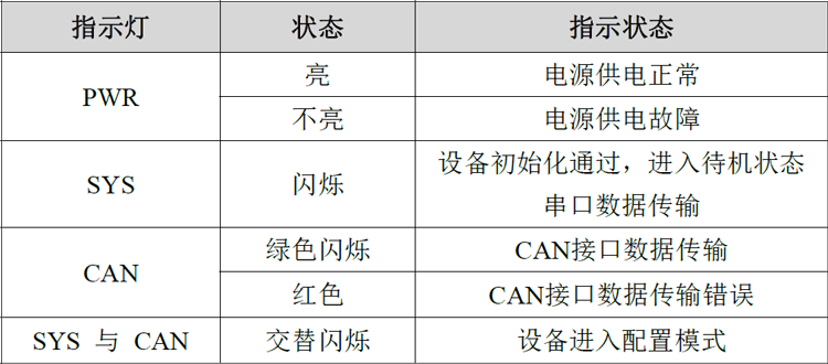GCAN-201模块具有1个PWR指示灯、1个SYS指示灯、1个CAN指示灯来指示设备的运行状态。这3个指示灯的具体指示功能及状态如下表所示。