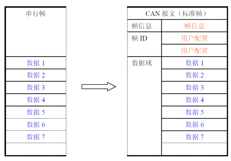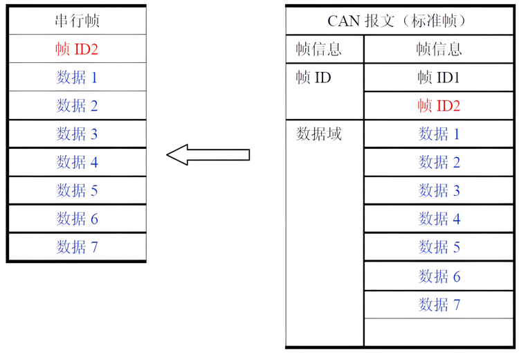 CAN报文的格式不变,只是CAN相应的帧ID也会被转换到串行帧中。(2)转换方式
