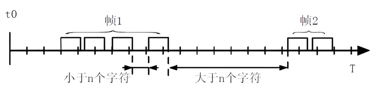 如果转换器在接收到一个字符后小于等于n个字符的传输时间内没有字符再被接收到,转换器就认为此帧传输结束,将该字符作为此帧的最后一个字符;n个字符时间之后的字符不属于该帧,而是下一帧的内容。帧格式如图所示。