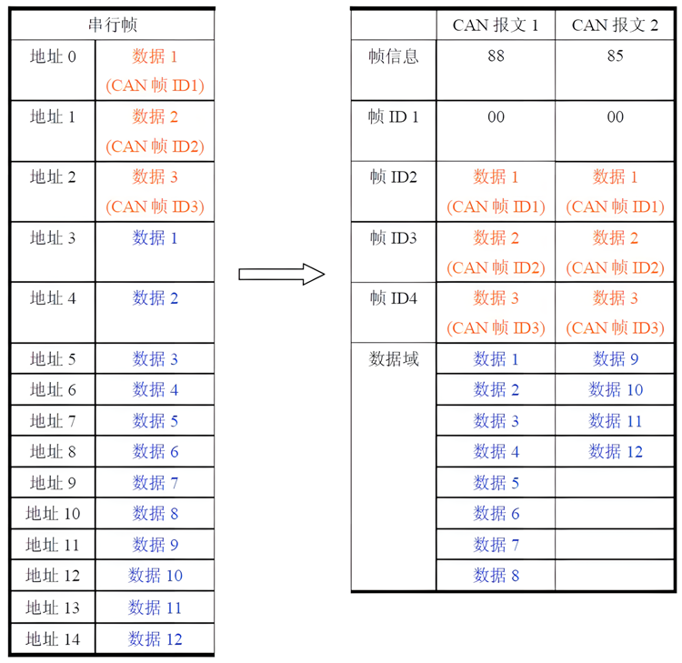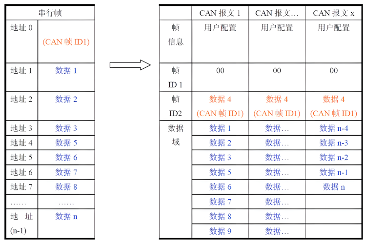 对于CAN报文,收到一帧就立即转发一帧,每次转发的时候根据事先配置的CAN帧ID在串行帧中的位置和长度把接收到的CAN报文中的ID作相应的转换。其它数据依序转发,如图所示。