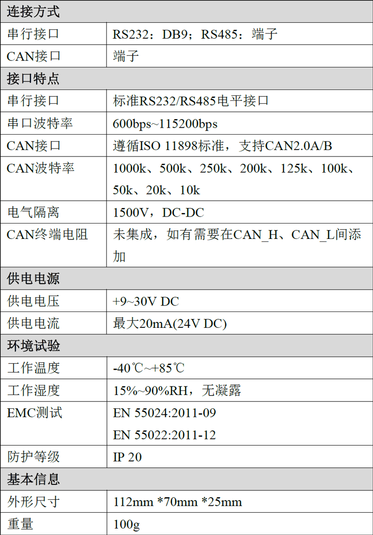● 一般情况下CAN波特率应该是串口波特率的3倍左右,数据传输会比较均匀(因为在CAN总线传输数据的时候还附加了其他的功能域,相当于增加了数据的长度,所以相同波特率下CAN传输的时间会比串行总线的时间长)。九、技术规格