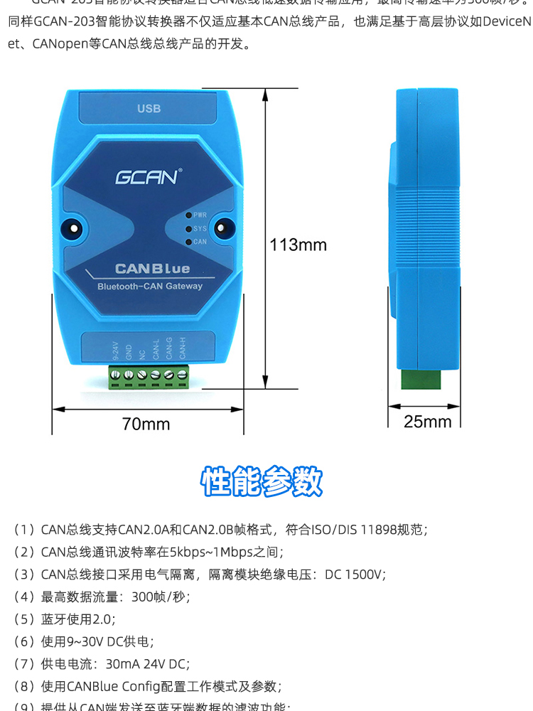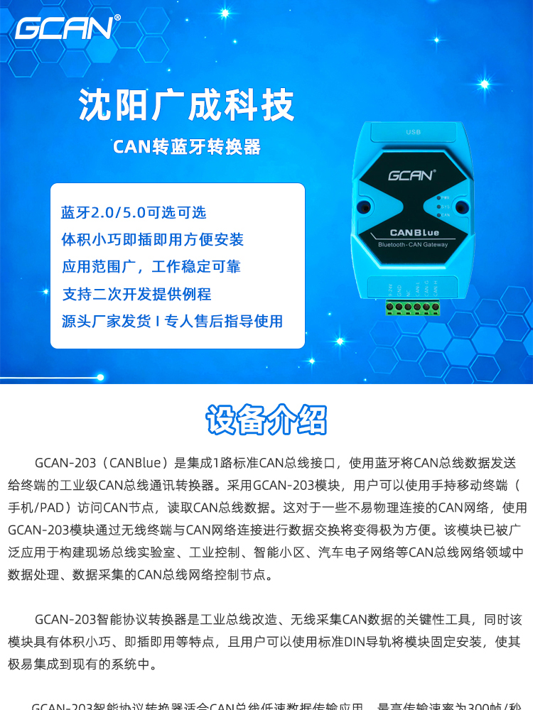 - 沈阳广成科技GCAN-203型CAN转蓝牙网关的设备参数包括: