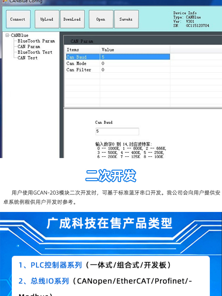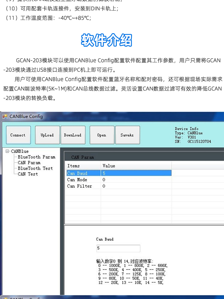 (1)CAN总线支持CAN2.0A和CAN2.0B帧格式,符合ISO/DIS 11898规范;(2)CAN总线通讯波特率在5kbps~1Mbps之间任意可编程;(3)CAN总线接口采用电气隔离,隔离模块绝缘电压:DC 1500V;(4)最高数据流量:300帧/秒;(5)蓝牙使用2.0;(6)使用9~30V DC供电;(7)供电电流:30mA 24V DC;(8)使用CANBlue Config配置工作模式及参数;(9)提供从CAN端发送至蓝牙端数据的滤波功能;(10)可用配套卡轨连接件,安装到DIN卡轨上;(11)工作温度范围:-40℃~+85℃; - 1、GCAN-204 modbus RTU转CAN设备使用