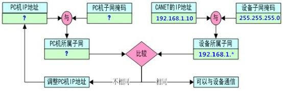 GCAN-212-B设备在出厂时设定了一个默认的IP地址(192.168.1.10)和网关(255.255.255.0),用户可以按图3.2所示的流程检查该设备是否和用户PC机在同一网段。