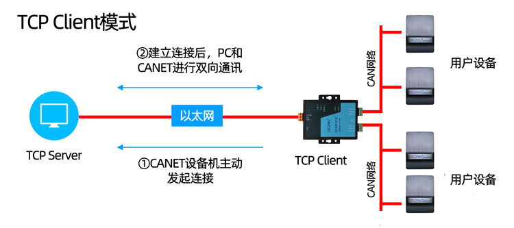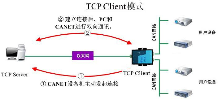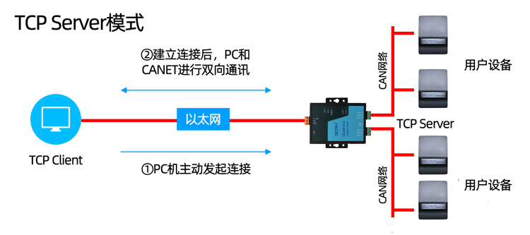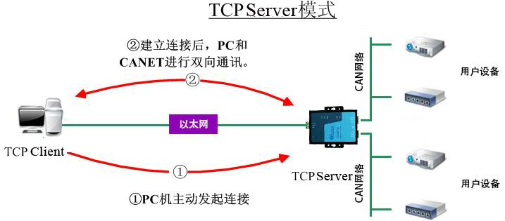 以太网端发送:10 00 00 08 01 02 04 01 00 01 00 00 00可设置CAN1的以太网工作模式为TCP Server模式