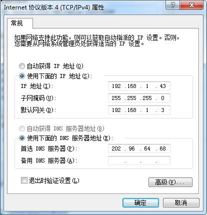 进入操作系统后,进入本机的控制面板→进入“网络连接”(WinXP)或“网络和共享中心”(Win7、10)→进入“本地连接”属性→“Internet协议(TCP/IP)”(winXP)或“Internet协议版本4(TCP/IP)”(Win7)属性,出现如图3.2所示界面。
