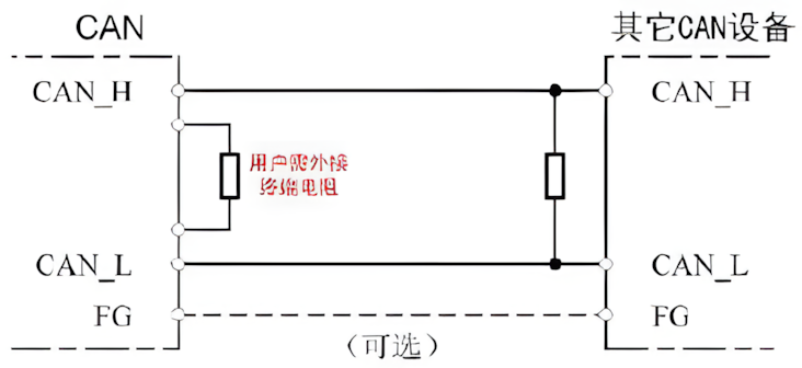为了增强CAN通讯的可靠性,消除CAN总线终端信号反射干扰,CAN总线网络最远的两个端点通常要加入终端匹配电阻,如图3.5所示。终端匹配电阻的值由传输电缆的特性阻抗所决定。例如双绞线的特性阻抗为120Ω,则总线上的两个端点也应集成120Ω终端电阻。