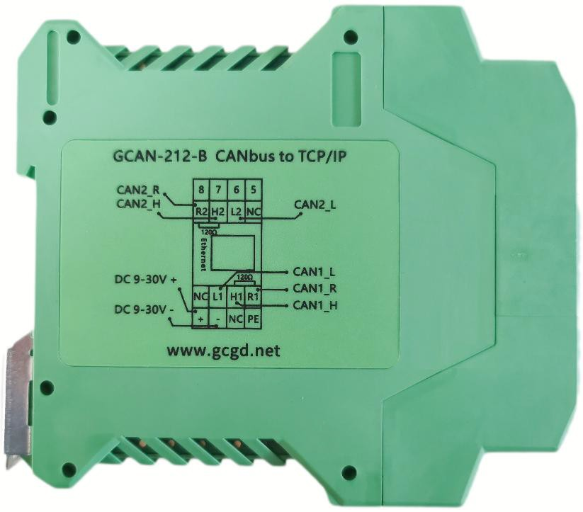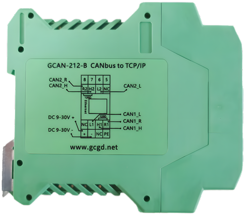 GCAN-212-B模块集成1路9-30V DC电源接口、2路标准CAN总线接口,CAN总线自带120Ω终端电阻(可通过连线接入)。GCAN-212-B模块接线端子如图2.3所示。