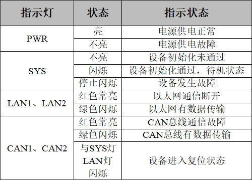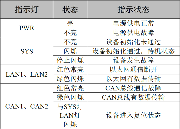 广成科技GCAN-212-B接口卡具有1个PWR指示灯、1个SYS指示灯,用来指示设备的运行状态,2个LAN指示灯、2个CAN指示灯,用来指示对应总线状态。这6个指示灯的具体指示功能见表3.2,这5个指示灯处于不同状态时,GCAN-212-B的状态如表3.3所示。