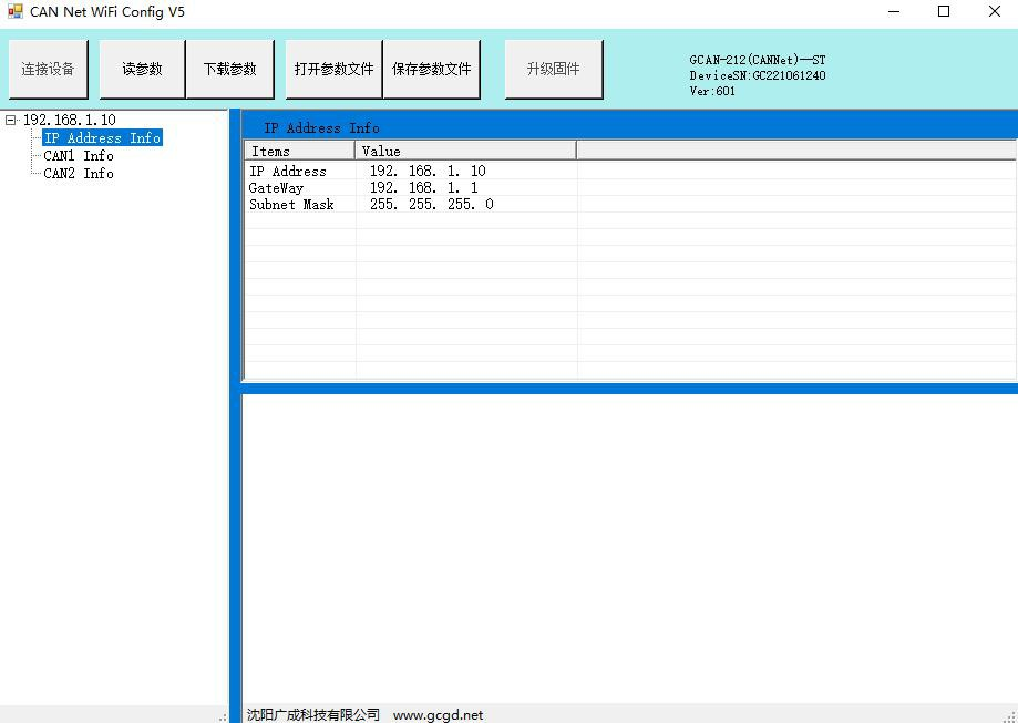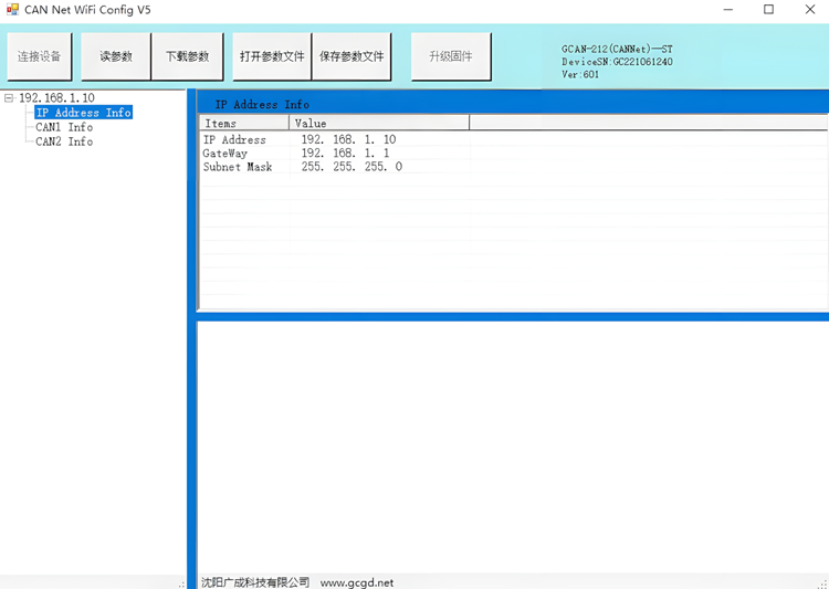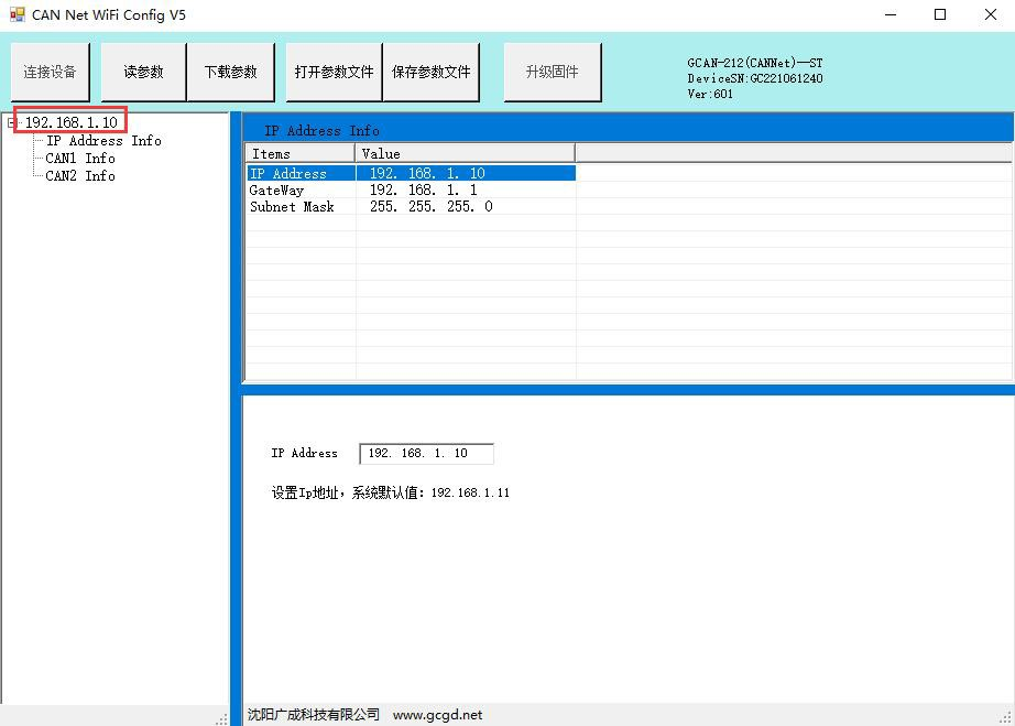 系统默认的IP:192.168.1.10,默认的CAN总线波特率是250K。