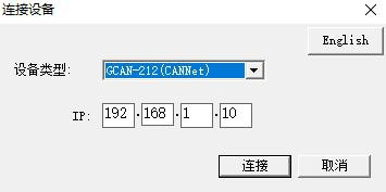 插入网线后,打开CANet-Wifi-Config-V5软件,选择CANet设备,输入IP地址:192.168.1.10(这个IP地址是固定的,不能修改)连接设备。