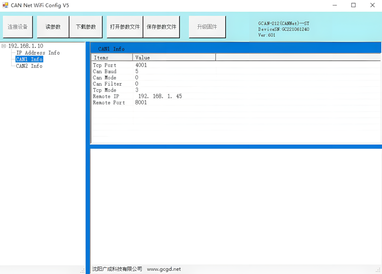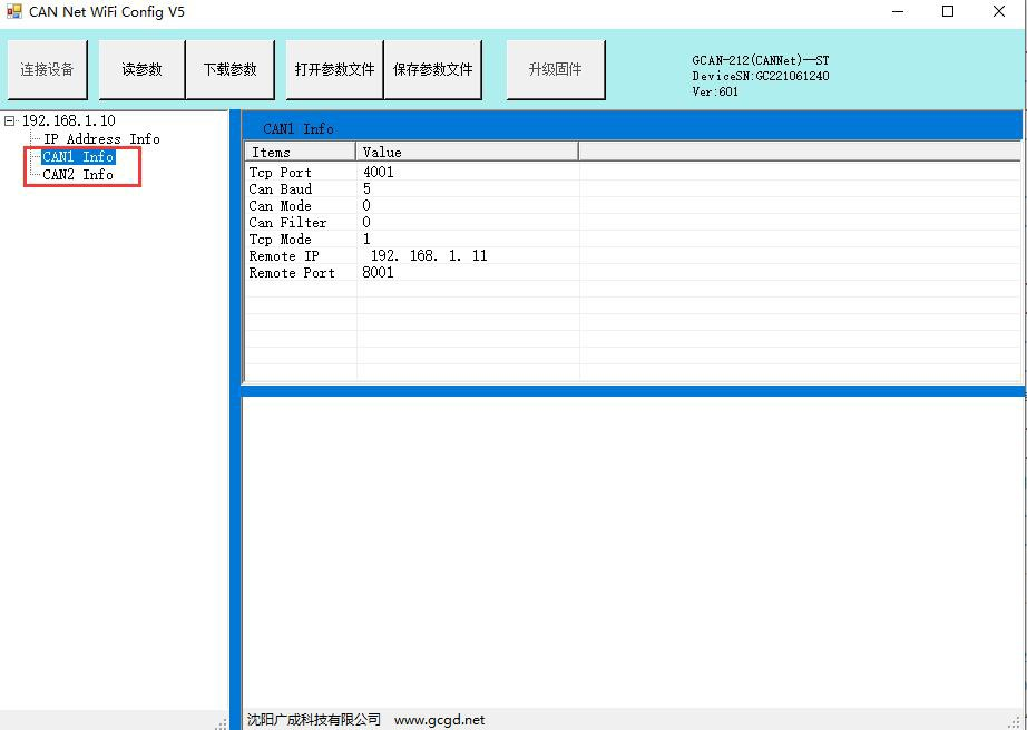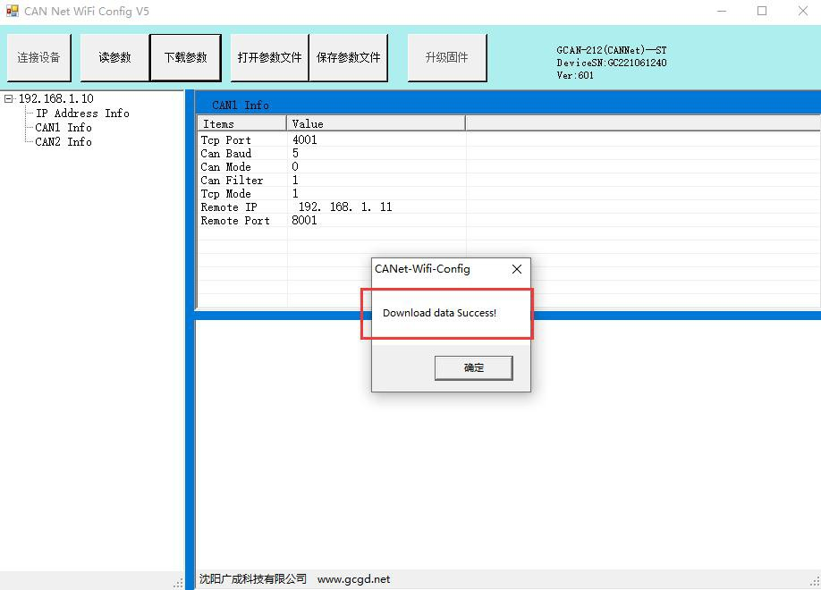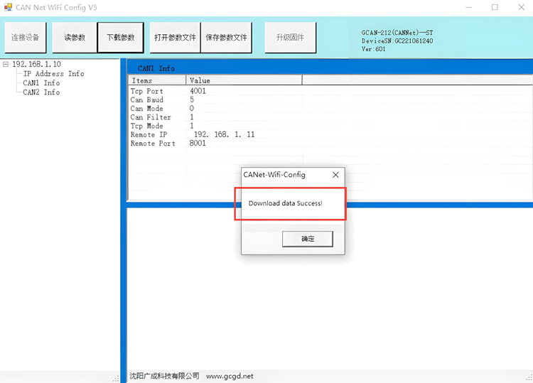 当用户对某一参数进行修改后,该部分将在软件中变成红色。当用户配置完成后点击“下载参数”即可将配置信息下载到GCAN-212-B的Flash中。
