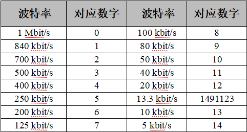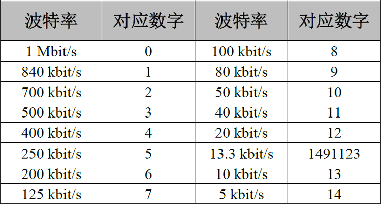 “CAN Baud”——设置CAN总线通信波特率;详细设置如表4.1