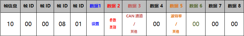 1)波特率:数据1,数据2:02 01表示设置波特率;0B 03表示CAN1-CAN2复位。数据3:01表示CAN1通道;02表示CAN2通道。数据5:00=1000K,01=840k,02=700K,03=500K,04=400K,05=250K,06=200K,07=125K,08=100K,09=80K,10=50K,11=40K,12=20K,13=10K,14=5K