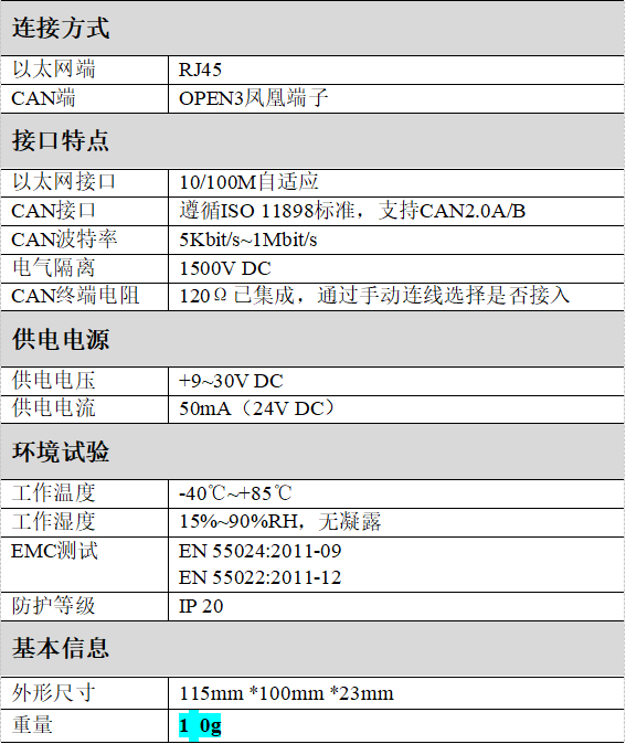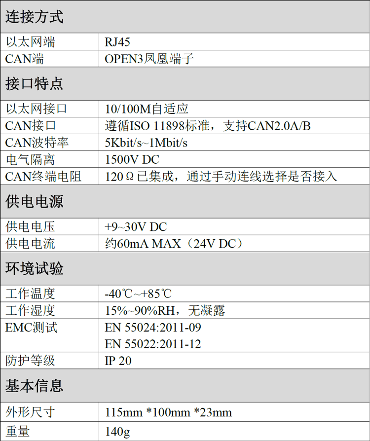 ● 高速的32位工业级处理器;● 内嵌硬件看门狗定时器;● 模块内置FLASH储存器,可储存参数;● 使用外接电源供电(9~30V DC)● 供电电流:60mA(24V DC);● 工作温度范围:-40℃~+85℃;● 静电放电抗扰度等级:接触放电±4KV,空气放电±8KV;● 电快速瞬变脉冲群抗扰度等级:±2KV;● 浪涌抗扰度等级:电源接口±1KV。CAN总线接口±4KV;● 工作湿度范围:5%~95%RH无凝露;