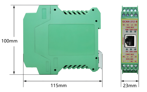 设备外形尺寸:(长,含接线端子)115mm*(宽)23mm*(高)100mm,其示意图如图2.1所示。