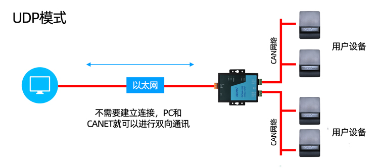 广成科技GCAN-212-B接口卡的以太网接口符合以太网标准协议规范,设备集成10/100M自适应以太网芯片,支持即插即用。用户可以使用标准以太网网线将工业以太网与GCAN-212-B连接。GCAN-212-B支持3种工作模式——TCPServer模式、TCP Client模式、UDP模式。这3种工作模式的介绍详情如下: