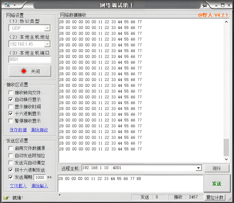 请注意:配置成功后需重新对GCAN-212-B设备上电。在使用网络调试助手时您需要勾选“十六进制显示”、“十六进制发送”。