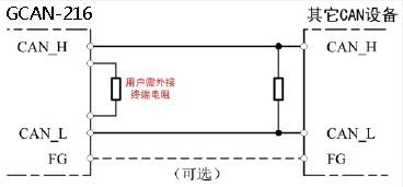 请注意:GCAN-216模块内部未集成120Ω终端电阻,模块外部提供电阻接线端子。需要接入终端电阻时,将电阻两端分别接入CAN_L、CAN_H即可。