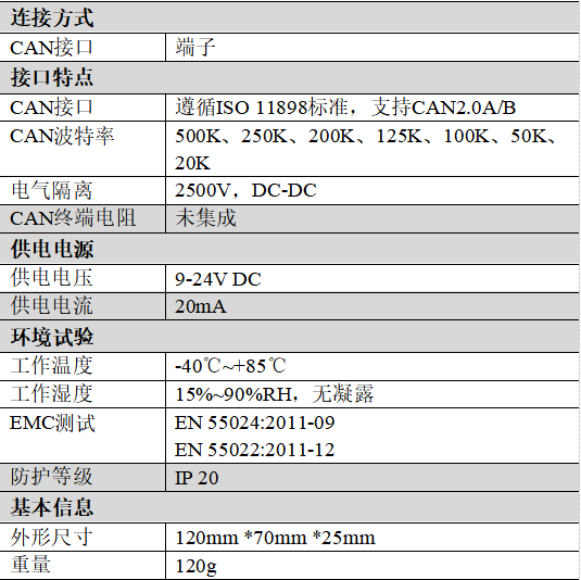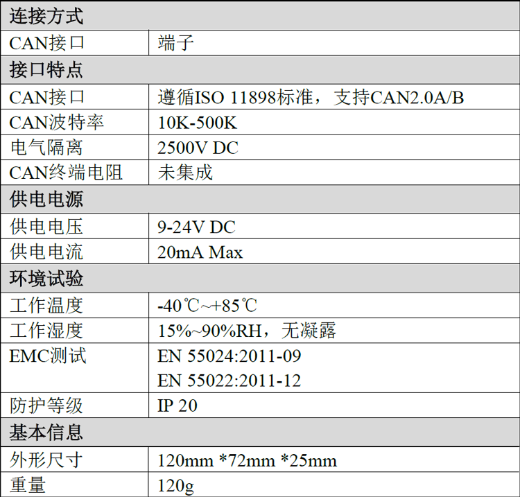 (5)CAN-bus接口采用电气隔离,隔离模块绝缘电压:DC 2500V;