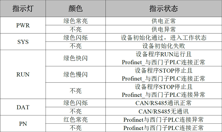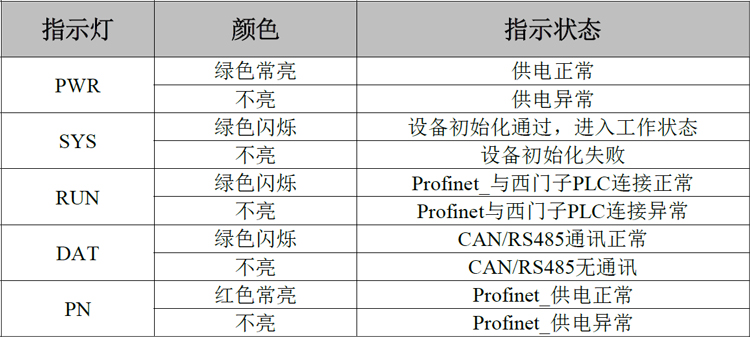 GCAN-GT-8321S的正面突出区域包含5个方形状态指示灯。指示灯的具体指示功能及不同状态下时,GCAN-GT-8321S模块状态如表2.2、2.3所示。