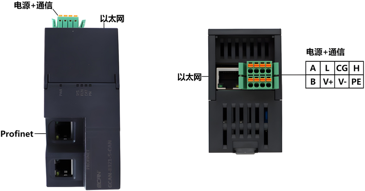 GCAN-GT-8321S模块集成2个标准Profinet接口、1个标准以太网接口、1路24V DC电源接口、1路CAN总线接口、1路RS488总线接口,GCAN-GT-8321S模块接线端子如图2.2所示。