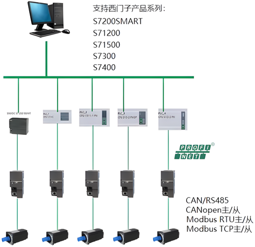 西门子PLC的Profinet接口连接8321S的Profinet接口,8321S的CAN接口连接CANopen从站的CAN总线接口。