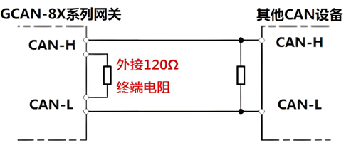 GCAN-GT-8321S接入CAN总线时仅需要将CAN_H连CAN_H,CAN_L连CAN_L,并保证CAN总线终端电阻为60Ω左右即可建立通信。
