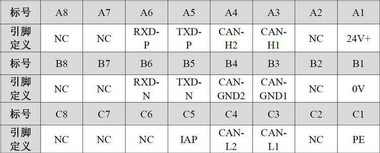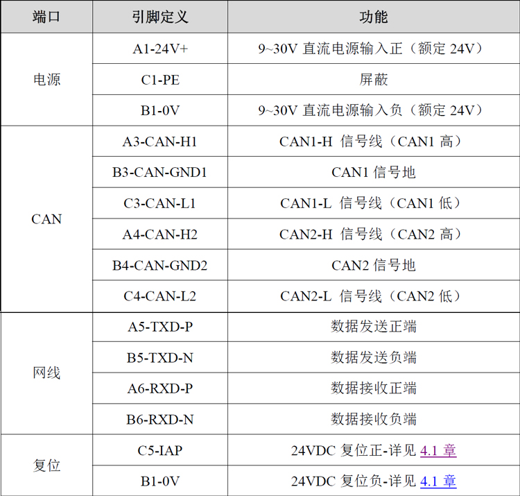 电源、CAN总线、网线接口位置,接口定义如表所示。