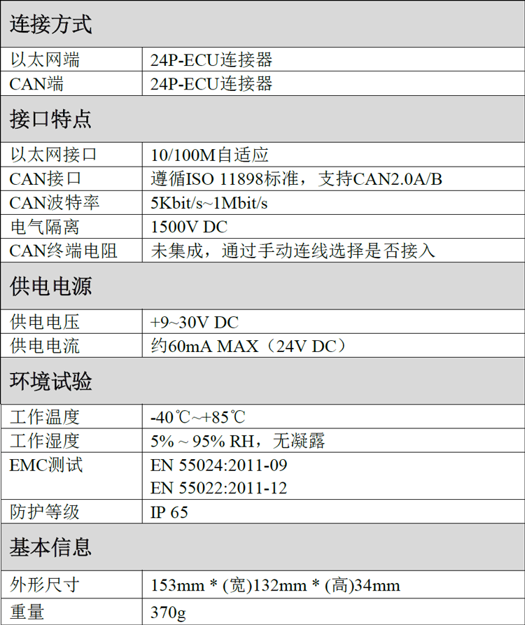 (9)浪涌抗扰度等级:电源接口±1KV。CAN总线接口±4KV;