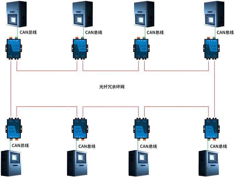 注:环网时,使用GCAN-208-2-F,单台设备或一段线路出现故障时,不影响系统中其他设备,保证系统稳定可靠的运行。