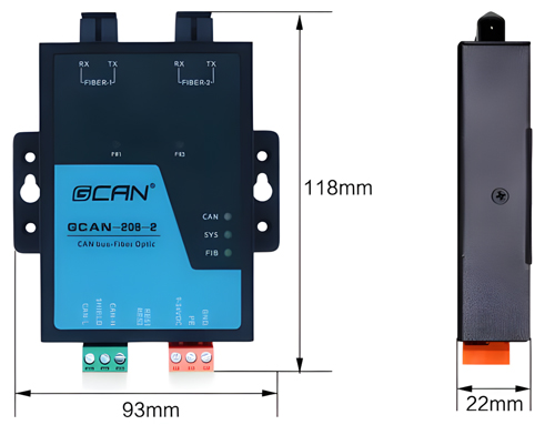 GCAN-208-2-F模块集成一路9-36V DC电源接口、1路标准CAN总线接口及2路标准光纤接口(单模、多模,SC、ST、FC可选)。