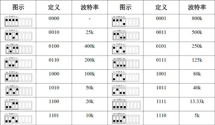当用户不知道CAN总线的波特率或通过拨码开关设置好波特率后模块无法正常工作,则可使用自动识别波特率功能识别总线的实际波特率,具体使用方法如下: