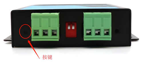 3.将GCAN-208-2-F模块上电,待PWR常亮,SYS灯闪烁时,使用工具按住如下图所示的CAN通道左侧孔中的按键,如图3.2所示。