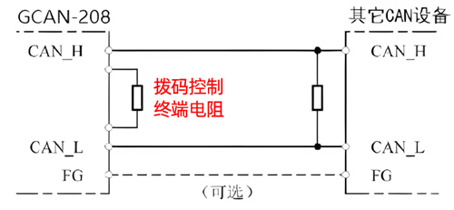 GCAN-208-2-F系列模块CAN通道内部均已经集成标准120Ω终端电阻,可通过CAN总线接线端子之间的拨码开关选择是否接入。