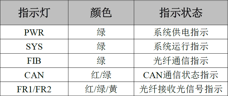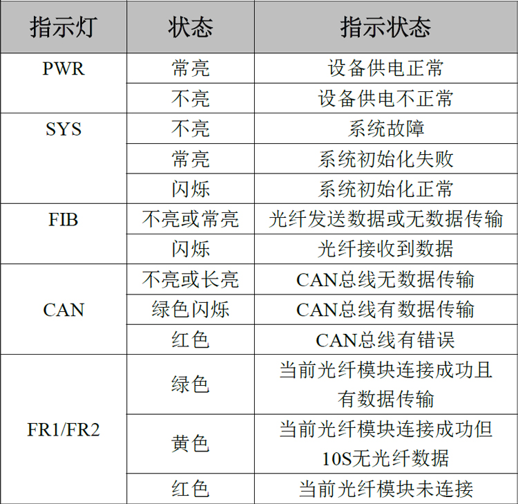 GCAN-208-2-F系列模块具有1个PWR指示灯用来指示系统供电情况,1个SYS指示灯用来指示设备的运行状态,1个FIB指示灯用来指示光纤数据传输,2个FR指示灯用来指示光纤模块接收光信号状态,1个CAN指示灯用来指示CAN总线数据传输。这5个指示灯的具体指示功能见表3.3,这5个指示灯处于各种状态的含义如表3.4所示。