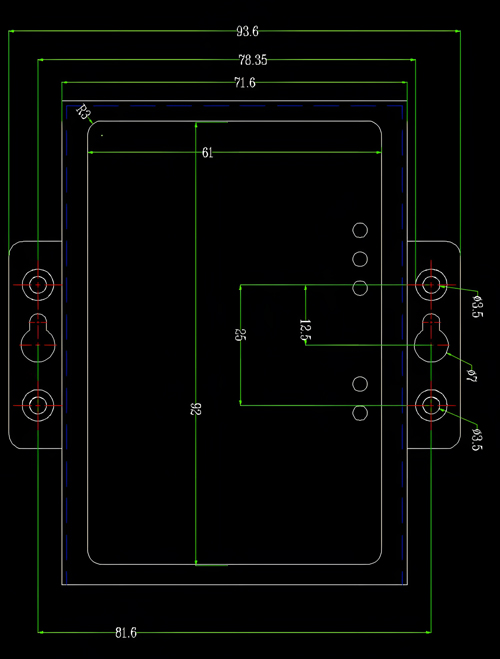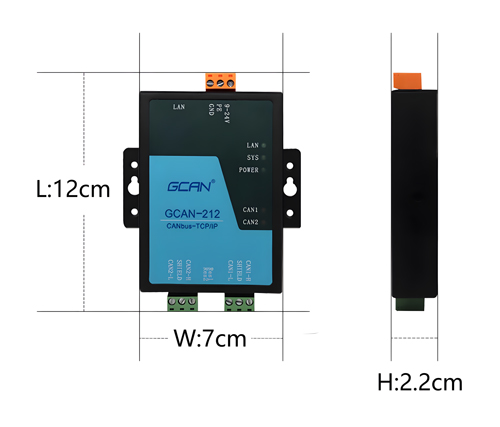 设备外形尺寸:(长,含接线端子)12cm*(宽)7cm*(高)2.2cm,其示意图如下图所示,用户可根据此尺寸设计GCAN-212的安装固定孔。