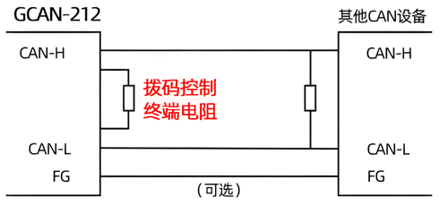 GCAN-212接入CAN总线连接方式为将CAN_H连CAN_H,CAN_L连CAN_L即可建立通信。CAN-bus网络采用直线拓扑结构,总线最远的2个终端需要安装120Ω的终端电阻;如果节点数目大于2,中间节点不需要安装120Ω的终端电阻。对于分支连接,其长度不应超过3米。CAN-bus总线的连接如下图所示。