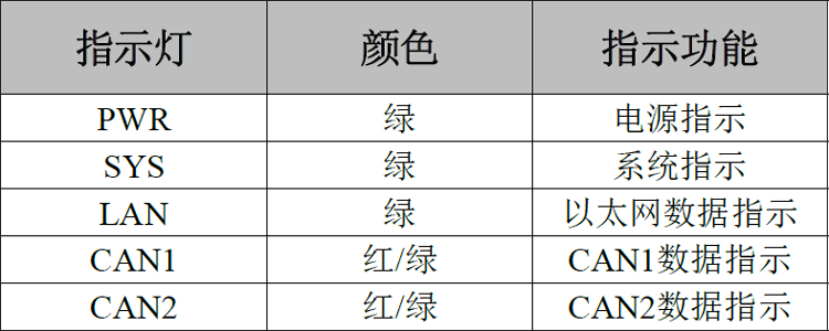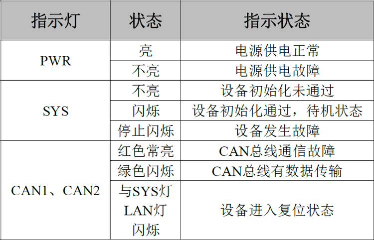 广成科技GCAN-212接口卡具有1个PWR指示灯、1个SYS指示灯,用来指示设备的运行状态,1个LAN指示灯、1个CAN1指示灯和1个CAN2指示灯,用来指示总线状态。这5个指示灯的具体指示功能见下表,这5个指示灯处于不同状态时,GCAN-212的状态如下表所示。