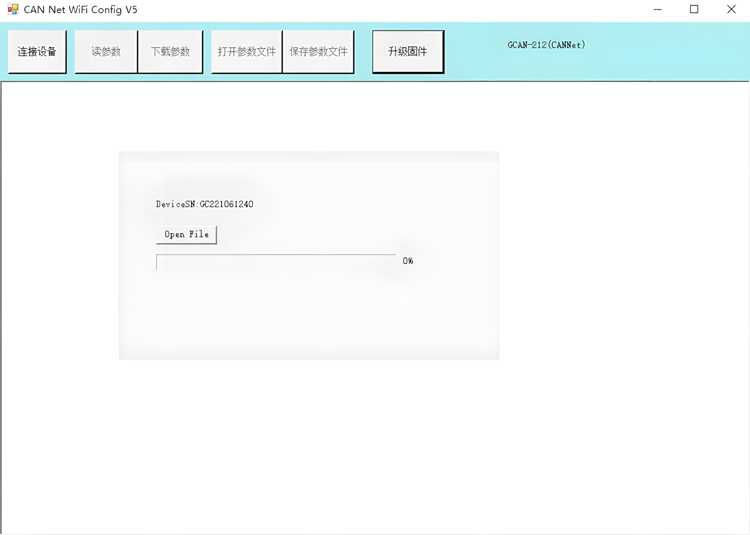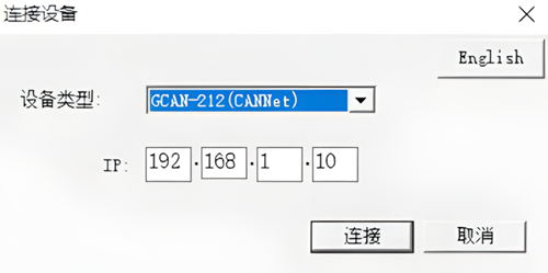 设备使用前需要进行参数配置。GCAN-212设备配置时只需连接电源并将以太网口连接至电脑即可。打开CANet-Wifi-Config-V5软件,设备类型选择GCAN-212(CANNet),IP地址输入GCAN-212的IP地址(默认IP:192.168.1.10)。