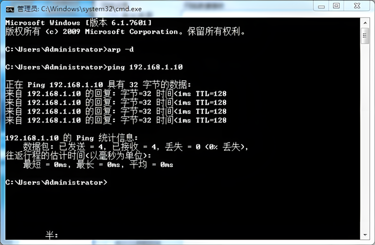 调试之前请确保您已将GCAN-212设备的CAN高(CAN_H)和CAN低(CAN_L)接入目标设备的CAN接口,连接时CAN总线两端均已连接了120Ω终端电阻。调试之前请确保您已将GCAN-212配置完毕。如果您使用PC机与GCAN-212设备进行连接,您可在GCAN-212设备上电后,进入计算机的cmd命令提示符(“开始”——“运行”——输入“cmd”后点击确定),依次输入“arp-d”命令和“ping 192.168.1.10”命令(或您配置的其他IP),确认GCAN-212已与计算机正常连接。正常连接后的cmd显示窗口如下图所示。