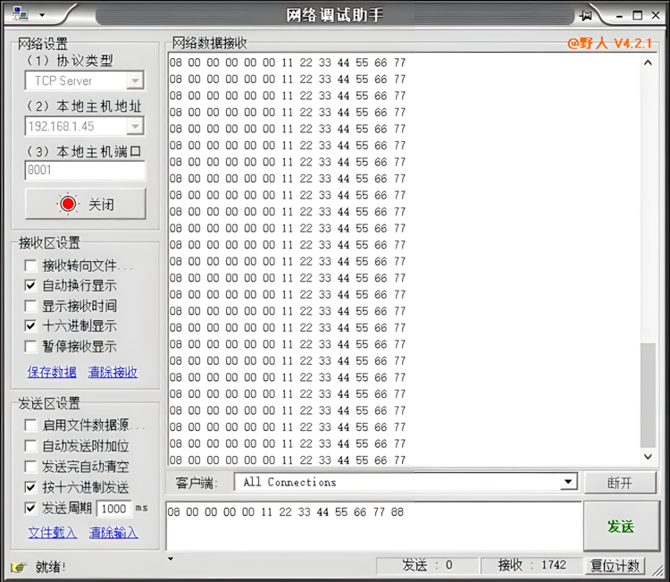 我公司向用户提供Net Assist网络调试助手软件,该软件可供用户测试GCAN-212在TCP Server、TCP Client、UDP模式下的收发功能。