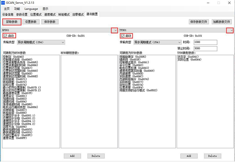 CAN总线波特率及CAN总线节点号可通过随货使用配套软件或者使用CANopen协议CiA DSP 305子协议中介绍的LSS功能进行配置。