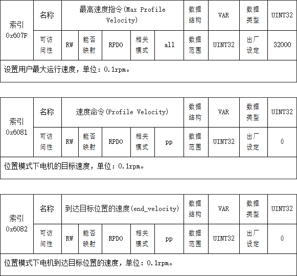 索引0x6099.1输入3000,单位0.1rpm,即第一段高速转速为3000*0.1rpm。索引0x6099.2输入300,单位0.1rpm,即第二段低速转速为300*0.1rpm。