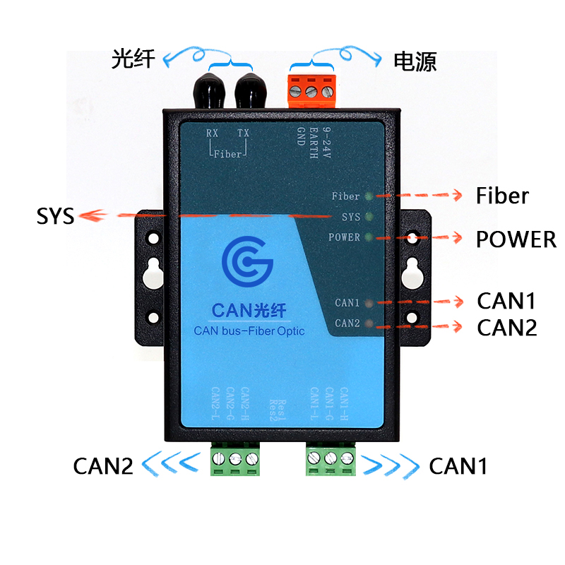 1、按照CAN口和光纤口集成数量来说,能够分成一路CAN两路光纤以及两路CAN一路光纤两种。