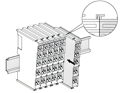 GCAN-PLC最多可以连接32个GC系列IO模块。插入模块时,一定要沿着凹槽,在已有模块的右侧顺次插入,直到锁扣卡死并发出“咔”的一声。当您正确组装节点时,在端子模块之间不会存在明显的缝隙。如果有一个模块未被正确组装,整个IO系统将不会正常运行。