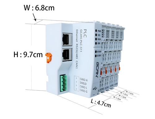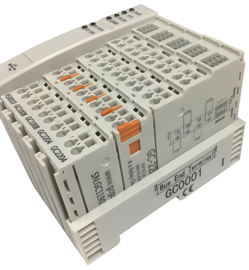 GCAN-PLC系列产品由一个可编程的主控模块(GCAN-PLC-511等)、若干GC系列IO模块(GC-1008、GC-3804等)以及一个终端电阻模块(GC-0001)组成。GCAN-PLC-511等主控模块可连接所有的GC系列IO模块,用户可根据现场实际需求自行选择扩展IO模块,在电源供应充足情况下,IO模块数量最多可扩展32个,其中当扩展模块数量超过16片时,需额外增加一片IO供电扩展模块GC 8012以保证电源供应充足,主控模块可根据插入IO模块的前后位置自动分配地址,实现自动组态,用户无需在PC上创建组态界面及设置参数。